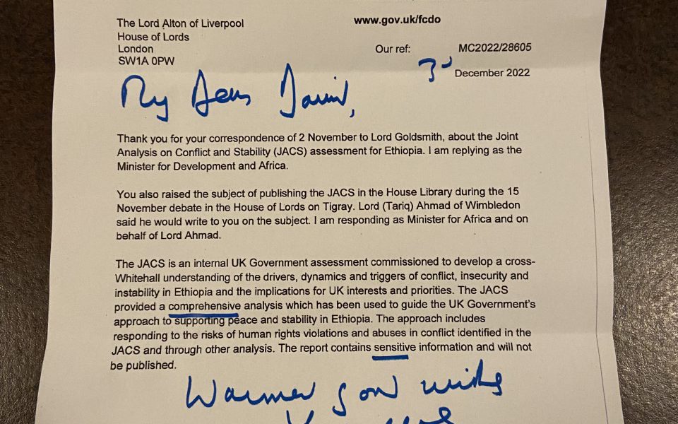 UK Minister for Development and Africa, RT Honorable Andrew Mitchell, in response to Lord Alton of Liverpool’ November 2 question on whether the UK government would...